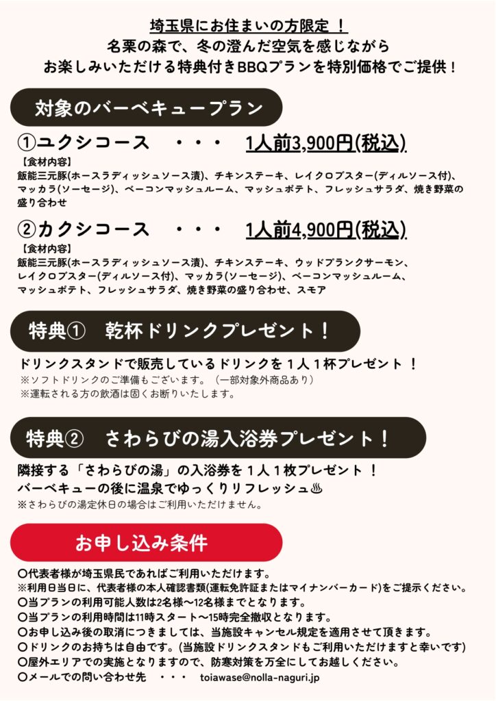 埼玉県にお住まいの方向けに、手ぶらで楽々BBQと名栗の温泉「さわらびの湯」利用券がセットとなったスペシャルプランの受付をスタートいたしました。